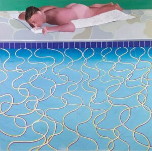 Neste trabalho vemos um homem elegante de pé à beira de uma piscina. Com as mãos nos bolsos, olha para dentro, onde outro homem está a nadar na sua direcção.