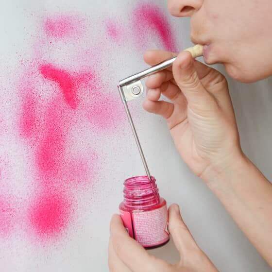 Os atomizadores de boca são muito baratos mas úteis, e supõem uma verdadeira alternativa ao trabalho com sprays para pequenas superfícies. Quanto à pintura, podes usar qualquer tinta líquida que não obstrua o tubo: por exemplo, aguarelas ou tintas acrílicas Amsterdam.