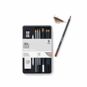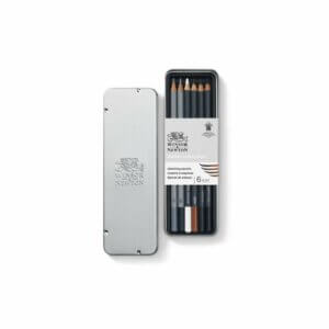Os lápis de grafite e de carvão são facilmente misturados, permitindo uma multiplicidade de combinações e sombras. Naturalmente, estes kits estão disponíveis na elegante caixa de lata com o logótipo Winsor and Newton.