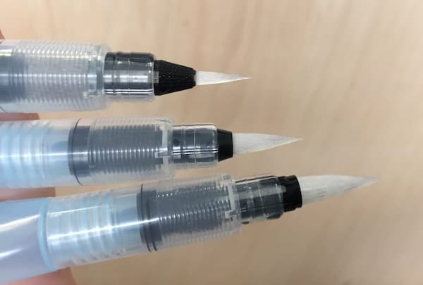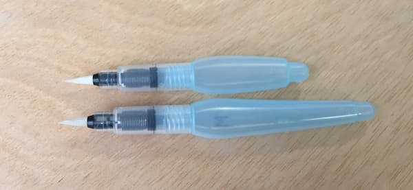 É claro que, dependendo da marca, há um acabamento ou outro. Por exemplo, no caso dos pincéis Derwent, a ponta plana termina em linha recta, enquanto noutras marcas que também têm uma ponta plana, como a Pentel, têm uma ponta pontiaguda como a que se pode ver na imagem (sempre à direita da imagem).
