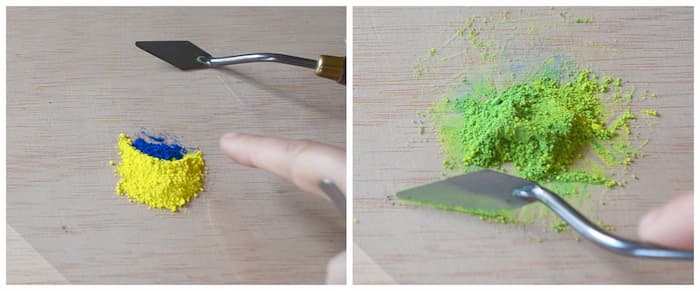 Neste caso, escolhemos um amarelo médio e um pigmento azul ultramarino, mas podes usar o que quiseres. Pesa as quantidades que queres e anota-o no teu caderno para poder repetir uma e outra vez as tuas misturas. Quando tiveres os teus pigmentos claros misture-os com uma espátula flexível.
