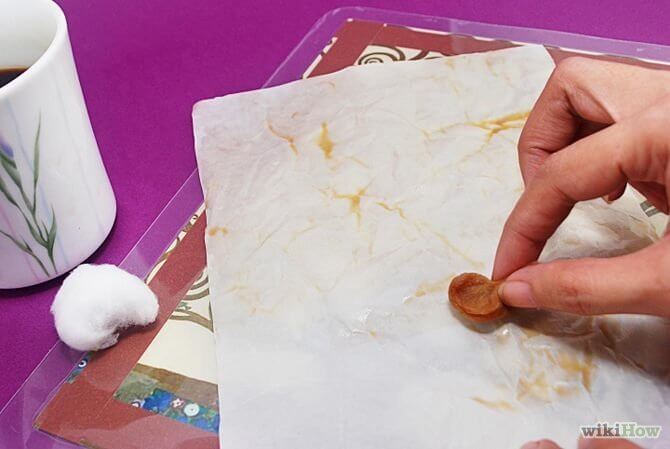 - Com um pedaço de algodão mergulhado no café (ou chá) tinjam as dobras do papel. É preferível que este passo seja feito com grande delicadeza. Adicionem a cor pouco a pouco, e segundo as vossas preferências, podem sempre adicionar mais. Podem, aliás, usar vários chás diferentes para lhe dar vários tons.