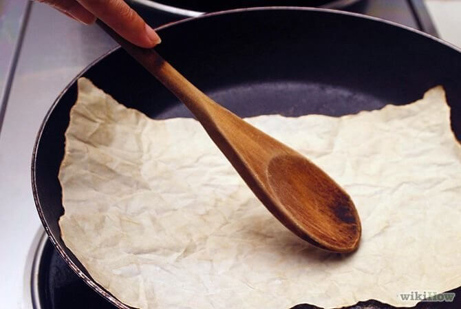 4. Queimem ligeiramente algumas secções do papel na frigideira. Para isso, coloquem o papel nela em fogo médio e pressionem em alguns pontos para escurecer essas áreas.
