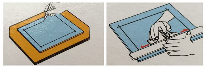 Medimos e marcamos a área externa do nosso passe-partout. Marcamos com um lápis e colocamos nosso cortador de oblíquos sobre a linha pela lâmina de 90º para ter um ângulo completamente reto. Com a ajuda da régua deslizamos o x-acto pela linha que queiramos cortar.