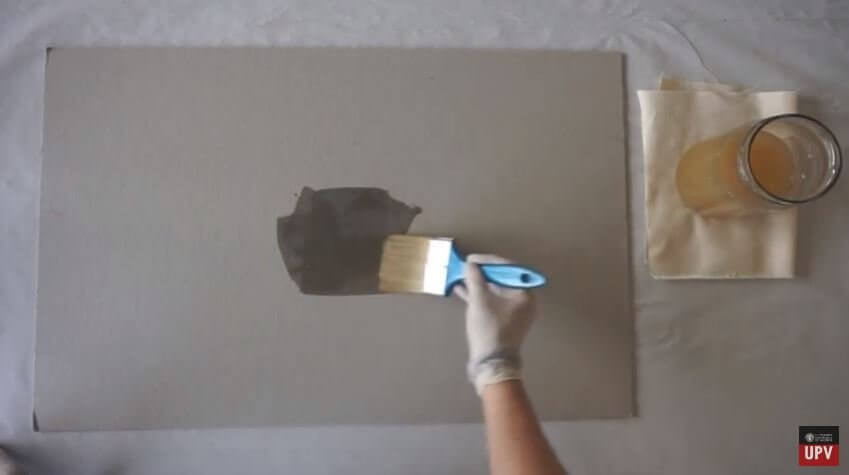 Uma vez que tenhamos preparada a água-cola devemos aplicá-la sobre nosso suporte. Recomenda-se a utilização de uma trincha e do centro do suporte para as extremidades.