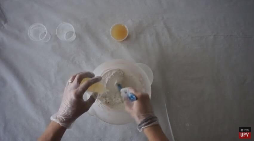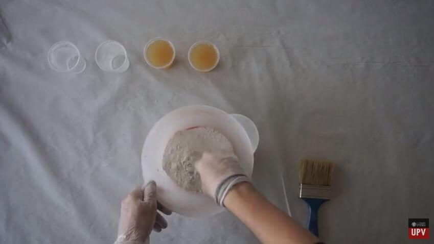 Uma vez aplicada a água-cola devemos realizar a mistura para a imprimação magra. Para isso, começaremos por misturar um copo de branco de titânio e um copo de branco de Espanha num recipiente.