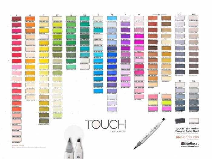 Finalmente, entre as características que tornam o marcador Shinhan um marcador muito especial está a sua carta de cores. A carta de cores dos Touch Twin Marker inclui 204 cores:
