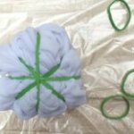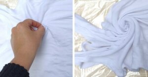 Para começar, molha a camisola ou peça de vestuário da tua escolha e torce-a bem, deixando-a húmida. Desta forma, a pintura será melhor absorvida. Também recomendamos que o laves de antemão sem amaciador para tecidos. Quando estiver pronto, espalha-o e, segurando o tecido com os dedos, torce-o para uma bola. Quando tiveres o tecido pronto, pega nos elásticos e fixa os nós: